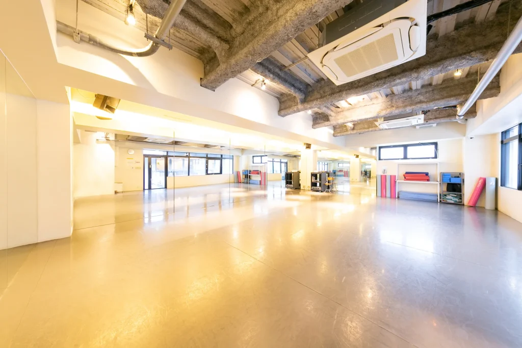 リノリウム床のスタジオです。ヨガやストレッチ系のレッスンにもおすすめです。窓からの換気がしやすいです。イベントレンタルには対応しておりません。