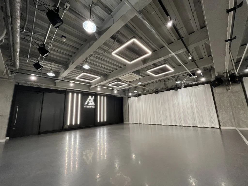 リノリウム床のスタジオです。照明設備が整っており、撮影にもおすすめです。HipHopやJazz、様々なジャンルに合わせられるよう、2面性のあるデザインにしています。バレエバーも設備されているため、バレエのレッスンにもご利用いただけます。